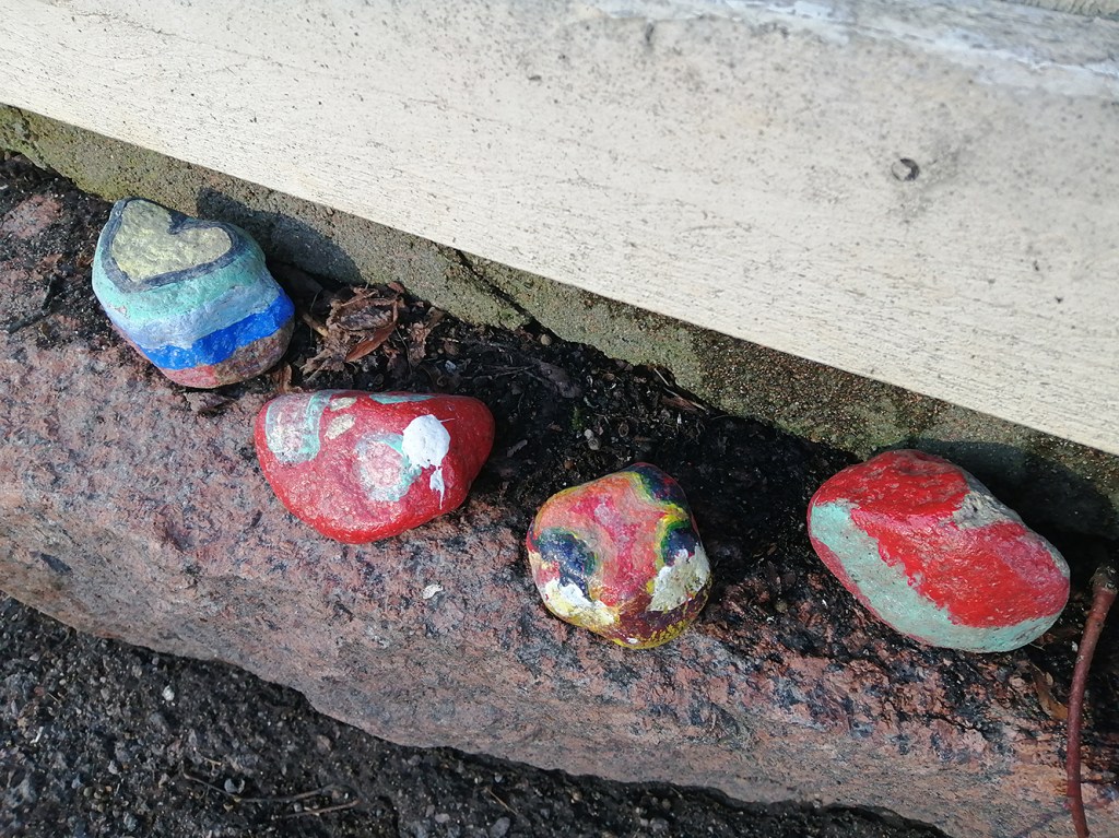Igår bongade jag de här stenarna invid planket till Gamla Apoteksgården. De hör inte till dem man får ta med sig hem och som man via olika grupper på Facebook anmäler att man hittat. Det här är prydnadsstenar som ska glädja förbipasserande.