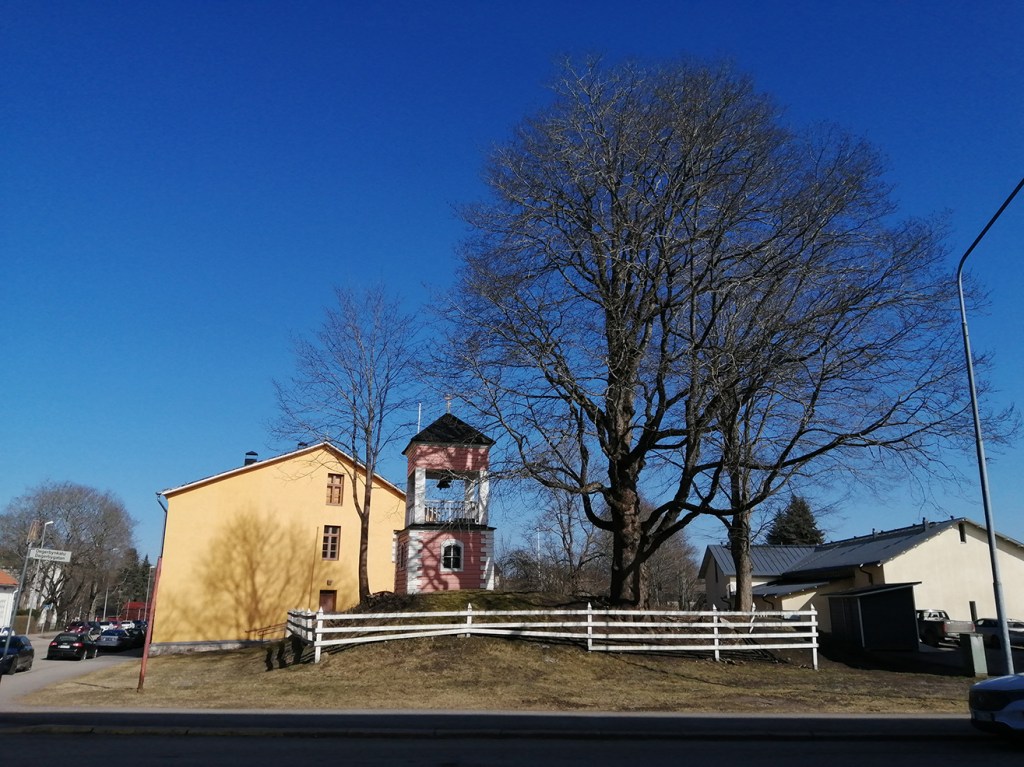 Jag tycker att himlen är extra blå så här års då solen skiner. Här har vi vår ortodoxa klockstapel i Lovisa. Den ligger i korsningen av Östra Tullgatan och Degerbygatan. Först efteråt, då jag tog fram bilden på datorn, ser jag hur fint skuggan av trädet avtecknar sig mot brandkårshusets gula vägg.