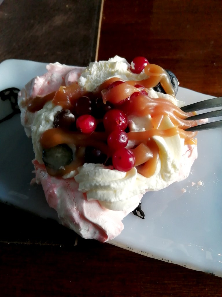 Från Tokmanni via Café Favorit som donerade en stor del av intäkterna i dag till Kvinnobanken. Fint initiativ. Min Pavlola-bakelse på bilden är något fraktskadad, men inte mindre god för det!