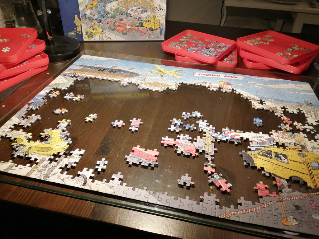 Jag har pusslat rätt mycket nu, någon timme varje dag, ofta redan på förmiddagen. Igår kväll såg pusslet ut så här.