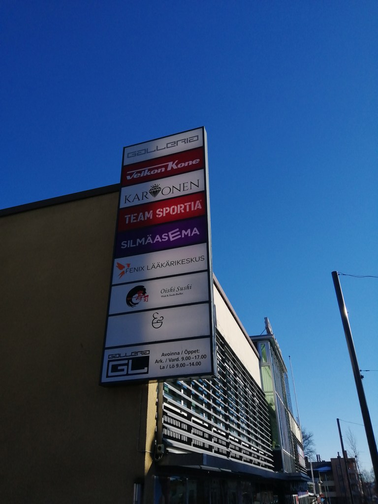 Två skyltbidrag. En som visar vilka affärer som finns i köpcenter Galleria. Och en annan som jag tog under en promenad förbi svenska lågstadiets tillfälliga barackbyggnader.