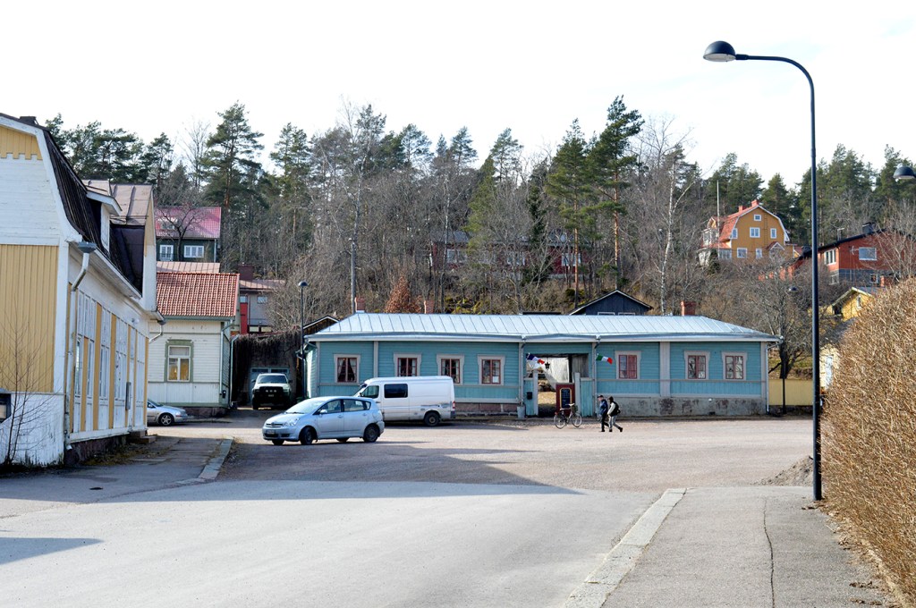 Saltbodtorg i nedre stan. Det blå huset heter i dag Vackerbacka och brukar hålla öppet under Lovisa Historiska Hus och ibland ha öppen trädgård. Där bodde för länge sedan folkskollärarinnan Ester Berlin.