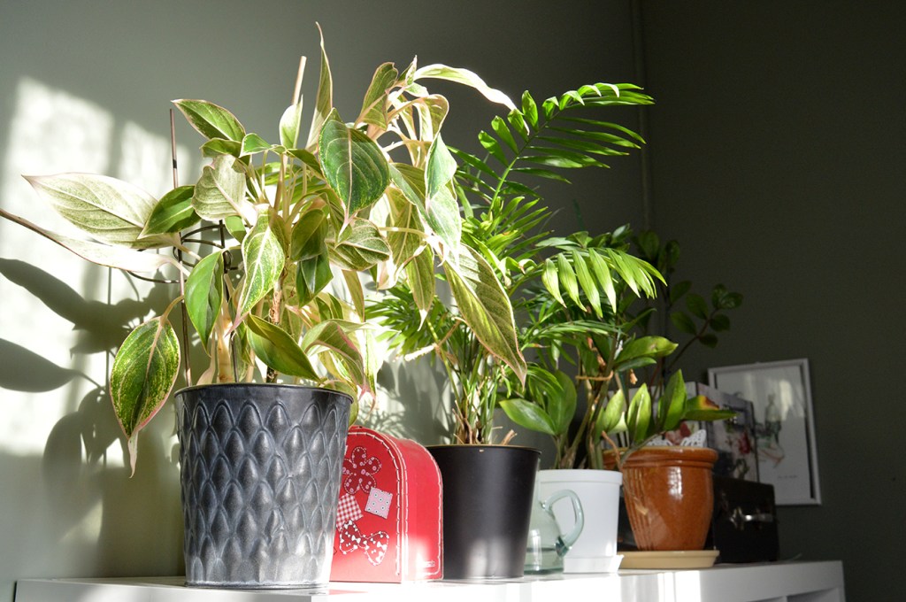 Nu står solen redan så högt, och inga träd i parken skuggar min bostad, så nu får även växterna på hyllan bakom mig där jag sitter vid datorn sol 🙂