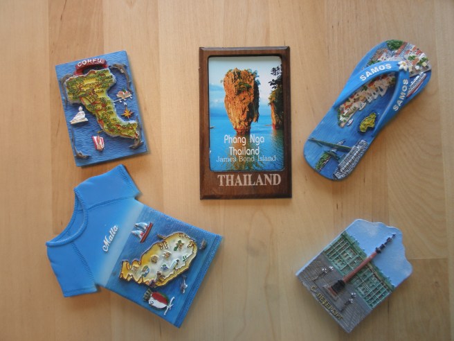 De flesta av våra kylskåpsmagneter är minnen från resor. Antingen har vi köpt dem själva på ort och ställe, eller också har vi fått dem av vänner som gåva.