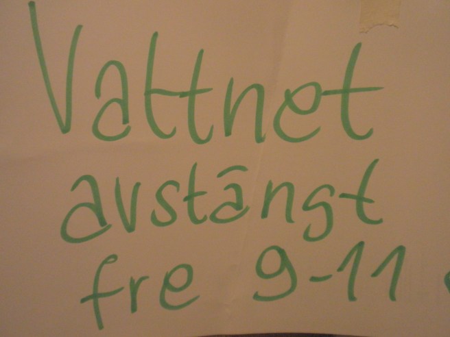 i morse. Den skulle fungera som påminnelse, men redan två minuter senare då jag ville tvätta händerna efter toalettbesöket var jag där och försökte få vatten från kranen. I köket kom jag