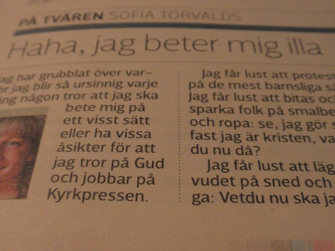 Hoppas för övrigt ni läser Torvalds ”På tvären” själva. Men några smakprov ska jag ge: ”Jag har grubblat över varför jag blir så ursinnig varje gång någon tror att jag ska bete mig på ett visst sätt eller ha vissa åsikter för att jag tror på Gud och jobbar på Kyrkpressen”. (Känns igen av lokaltidningsreporter – ska jag ha vissa åsikter och bete mig på ett visst sätt för att jag jobbar på ÖN).