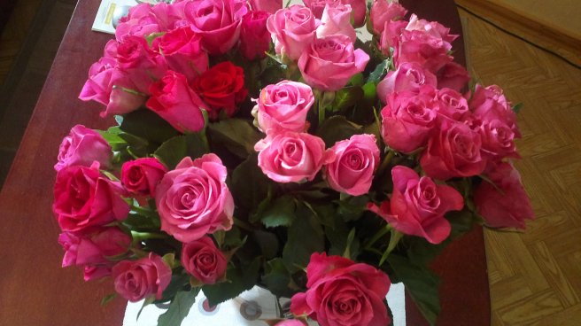 ”Ja, men du har ju aldrig förr fyllt femtio” sa Guuben som uppvaktade mig med ett resebidrag, mackor, kaffe, juice, champagne, grattiskort i trä och femtio rosor… Ooooh, så glad jag blev!