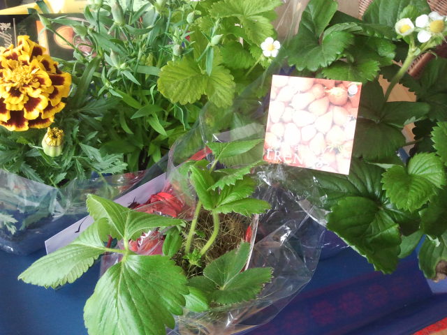 Jordgubbar och tagetes ska snart få mer mull och planteras i större utekruka.