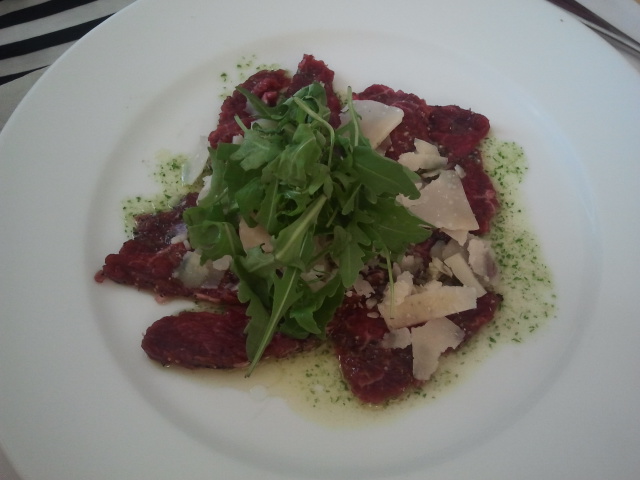 På Saltbodan åt en av fem i gänget i går carpaccio på oxfilé till förrätt. Jag säger redan nu att alla rätter vi åt fick tio poäng med papegojmärke och några extra poäng till. Helt utsökt gott!