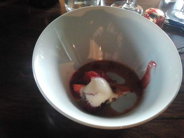 Såväl mat som efterrätt var väldigt goda. Portionerna är små, så om du vill ha lassvis med potatis, mycket sallad, stora kött- eller fiskbitar ska du inte välja denna gourmet. Här satsar man på ett vackert upplägg. Tycker själv att storleken på portionerna är bra, men en skogshuggare skulle kanske inte tycka lika.