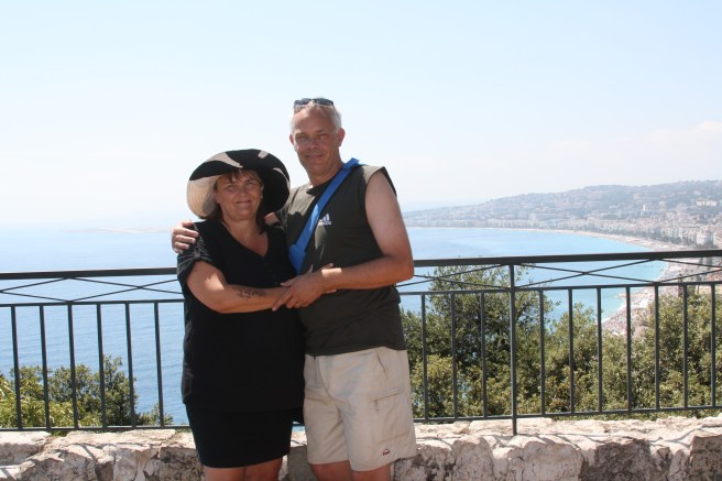 En vänlig ung dam erbjöd sig att ta bild av Gumman och Gubben på utsiktsplatsen, Slottskullen, i Nice.
