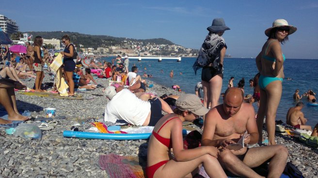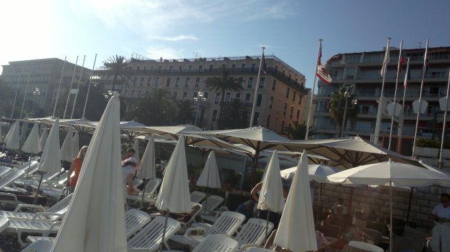 En av gratisstränderna i Nice. Nästan varje kvadratmeter packad, men det är ok om man inte har större krav än att få sitta ner.