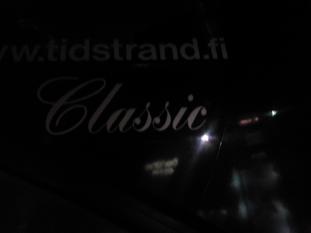 Den här bilden är tagen klockan 21 på kvällen. Vi är på väg hem med supporterbussen. Jag ser att modellen på den heter Classic. Det finns också ett lag i ligan som heter Classic, så jag frågar chauffören om jag håller på att kliva på fel buss. Är vi är på väg mot Tammerfors? Jag är inte säker på att han förstod min ordvits.