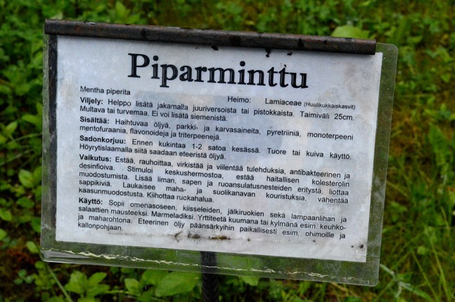 De här skyltarna finns i anslutning till Frantsilan Kehäkukka, där det finns en örtagård. Jag försökte inte ens räkna antalet örter, de måste ha varit över hundra. Men visar två skyltar i dag och ett par bonusbilder från örtagården som får förmedla stämningen där.