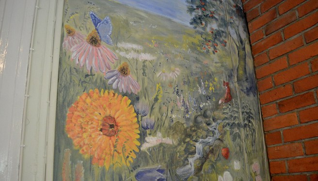 Lunch- och försäljningssalen.Mera produkter. Gillar att man bevarat mycket av det gamla huset.Här fanns turistinfot men också bodar där det såldes såväl hantverk som loppisgrejer.Ingången till en av bodarna.En gammal stol och ett blomsterarrangemang välkomnar.
