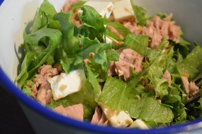 Av min syster fick jag också ett enkelt salladsrecept. Hon hade även keso och frön i salladen, men jag nöjde mig med issallad från Robbes trädgård (lokalt producerat), Abbas tonfisk i vatten, salladsost i örtdressing och rostad lök.