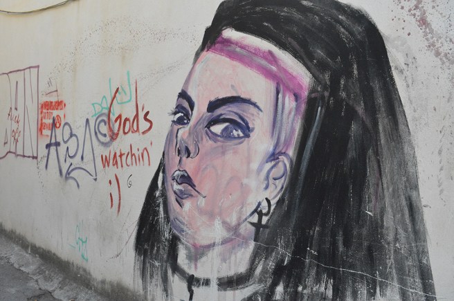 Ingen aning om vad som dolde sig här bakom. Nåt slags klubb tror jag.Vad tänker hon på? Ser smått skrämmande ut. Ja, okay, God´s watching – men det är väl också bra ibland 🙂Det betyder säkert något, men jag bara knäppte bilder hejvilt och känner inte till eventuell symbolik.Klotter? Symboler? Budskap?