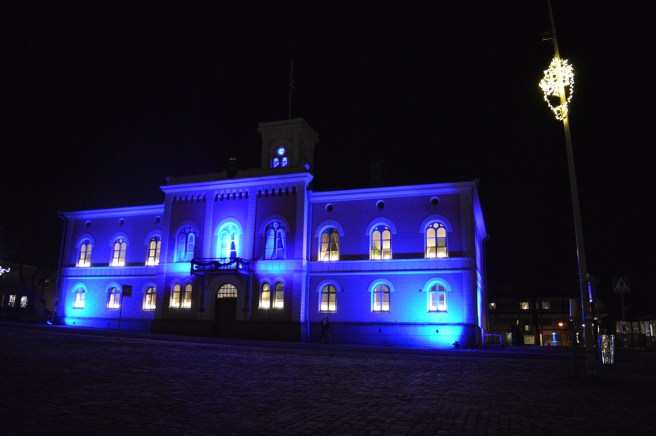Men så kom jag att tänka på vårt vackert upplysta rådhus (kallas inte stadshus i Lovisa). Och här får ni också se det där vackra smycket i kvällsbelysning.