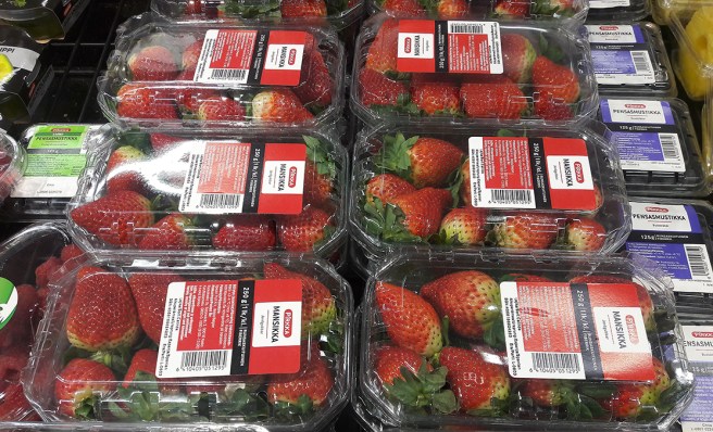 1. Hej Carita ja jordgubbarna är nog från Spanien inte Finska så prova smakar gott mognar fortare här därför smala och längre men får inte kallas jordgubbar här men dom Finska är nog sötare o längre mognads tid så blir dom runda .Sen en fråga vad kostar dom ?????