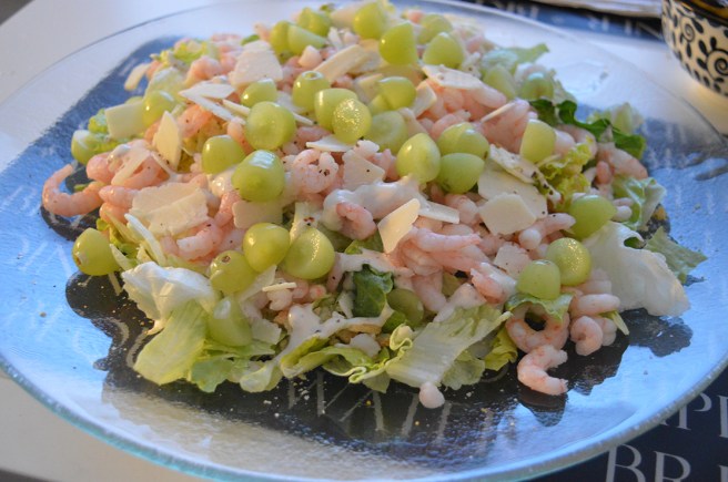 Lyxigt blev det, fastän salladen i sin enkelhet görs så att man häller upp en påse med salladsblad på ett fat. Sedan krossar man krutonger, lägger på tinade räkor, färdigt skivad ost (parmesan eller annan som finns på påse), dressing, vindruvor, havssalt och peppar.