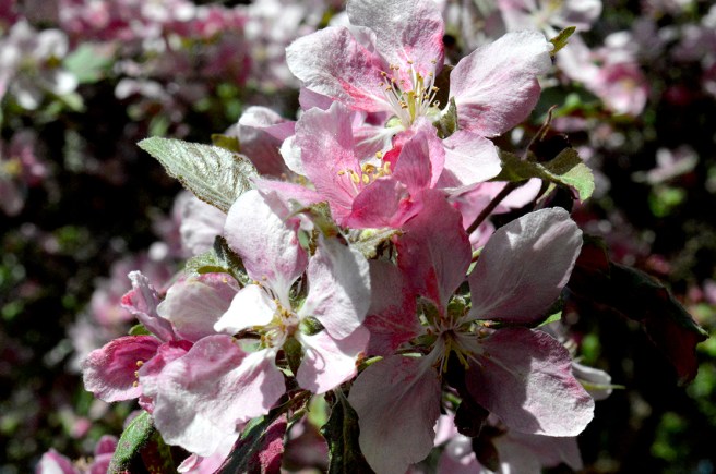 1. Undrar om det rödare är ett prydnadsäppelträd… Vi har två sådana, ett med djuprosa blommor och ett med liknande de här. I äppelgården, där vi har tiotals sorter, är det enbart Röd Melba som är lite, lite rödskiftande. Och de flesta röda körsbärsblommen – bergkörsbär, bl.a. – har blommat färdigt för en tid sedan. Tyvärr. De är så vackra…