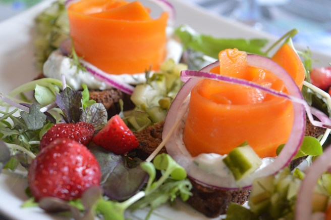Veganfavoriter i repris. Vårrullar och ”laxrullar” (av morot) på mörkt bröd, och säsongens fräscha bär.