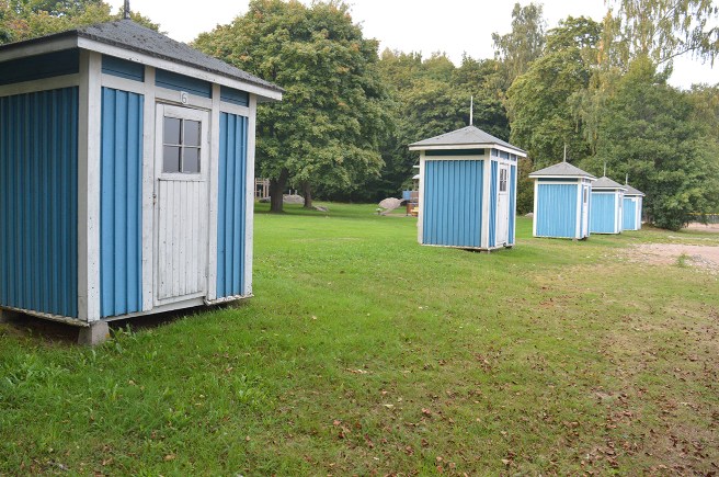 Vackra, blå och små badhytter på rad.Hemtrevligt.