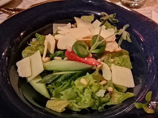 Förrätten var en sallad med parmesanost, toppad med en jordgubbe.