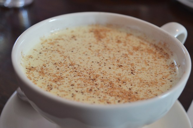 Möte med två kollegor mitt på dagen. Det blev födelsedagskaka och en spännande dryck med gurkmeja, svartpeppar, kanel och mjölk 🙂