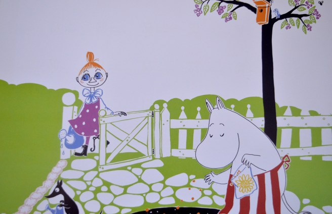 Muminmamman sår frön som ska bli sommarblommor. En grind som öppnas, vänner som hjälper till med vattningen. En fågelholk och dess invånare (syns bara en på bilden) och insekter som surrar kring blommorna i trädet. Det är sommar det!