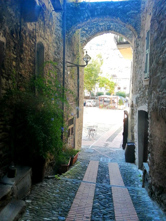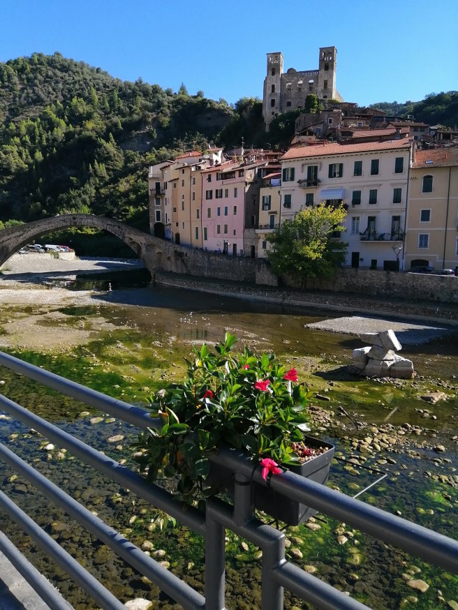 Här steg vi av bussen och vandrade framåt och mot höger där den medeltida bron Il Ponte Vecchio ligger.Mellan det rosa och gula huset i mitten på bilden fanns en av ingångarna till gränderna. Uppe på kullen ligger Castello del Doria.Alla dessa underbara smala gränder i eller i närheten av Castello del Doria.Resenärer på upptäcktsfärd.Det här var nog inte riktig rosé, tror jag 😀 Tippar på färgat vatten.Marknad i Dolceacqua.