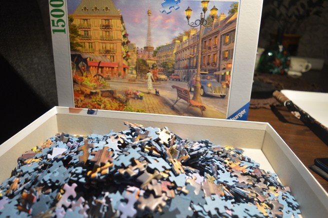 Den här kvällen och en del av morgondagen går till sortering. Många kantbitar har redan hittats. Himlen landar i en låda, tydliga detaljer i en annan. Brunt tak, tornet i bakgrunden, blommor och annat som går att urskilja sorteras också omsorgsfullt. Utan brådska. Inga krav tynger mina axlar. Grubblerierna får vingar och flyger sin kos.