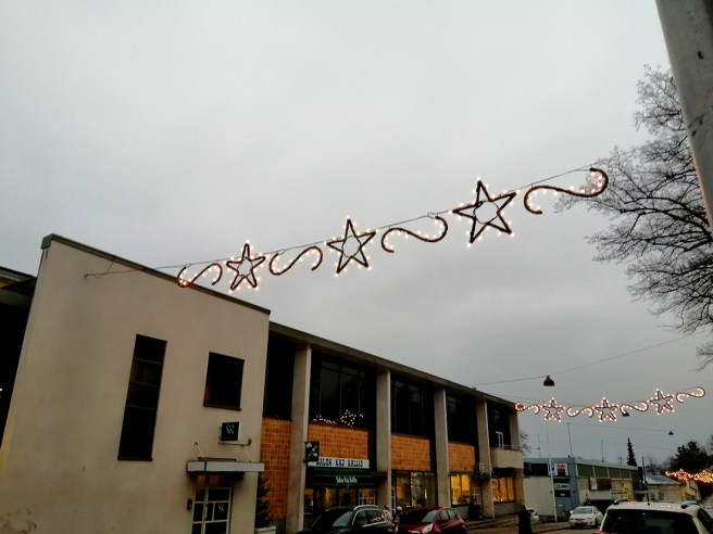 Någon snö har vi inte ännu, men det är bra såhär om nån frågar mig. Det var ännu ganska ljust ute då jag gick på mina ärenden under en paus i jobbet, så belysningen ovanför gatorna kom inte helt till sin rätt.