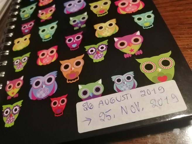 Jag skriver så gott som varje dag, för hand. I medeltal blir det ett häfte på tre månader, alltså fyra i året. Ibland skriver jag bara en sida, ibland tre eller fyra sidor, och alla sidor pryds med klistermärken 🙂
