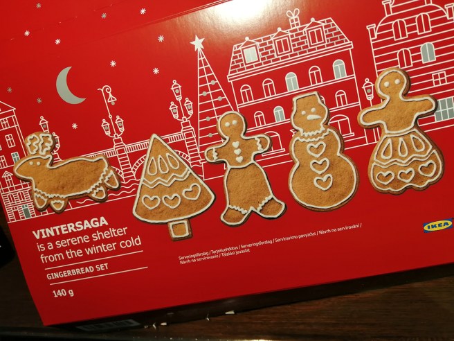 Och vad köpte jag? Ett Brimnes-skåp, och sedan enbart annat som jag behöver. Två vita dokumentlådor i hårdplast, fyra blockljus, en krukväxt (bara en! … bonzaiträd), värmeljus, en svartvit handhandduk, svarta galgar och från delikatessbutiken ett kit med pepparkakor där allt finns med då det gäller dekorationer.