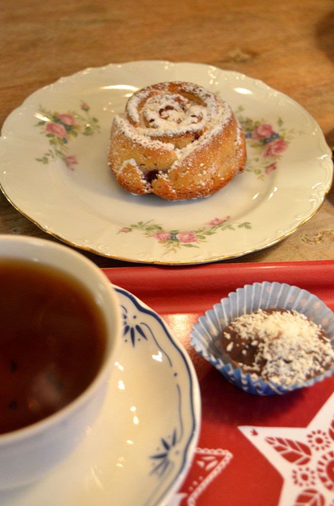 Te, hallonkaka och en liten godbit med plommon och nötter var en stor njutning i Konungsdammens julhem i dag.