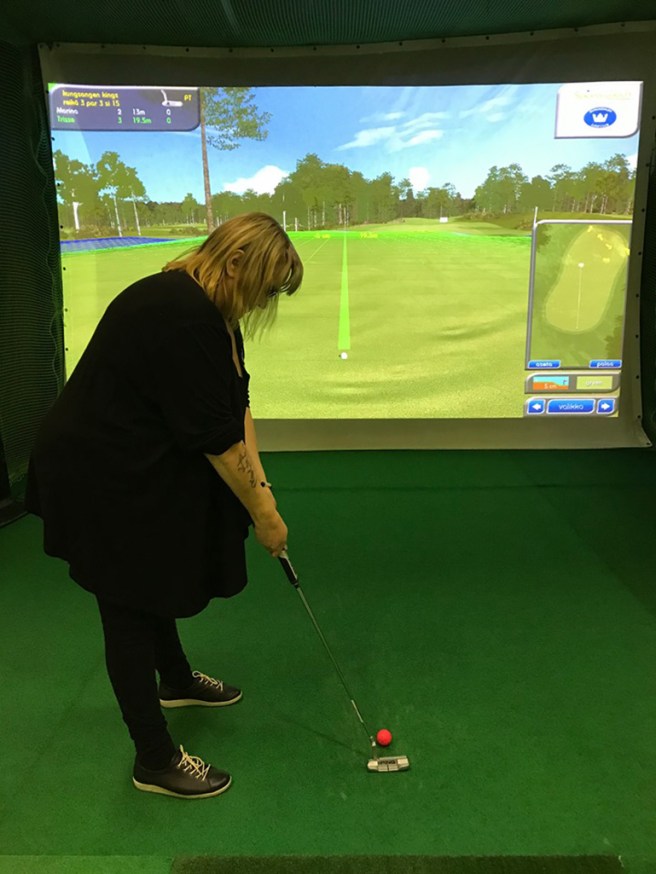Uppmuntrad och påhejad blev jag av min vän Marina. Hon blev biten av golfflugan för några år sedan och spelar redan riktigt bra både inomhus och utomhus. Hon gav goda råd då det gällde slagteknik och vilka klubbor jag skulle använda i vilka lägen.