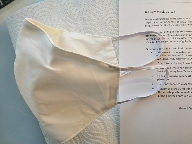 Då har du, Gerd och jag skaffat oss ansiktsmasker av olika modell er jag. Om jag ska vara ärlig har jag visserligen masken i jackfickan, men jag har inte använt den än. Bra att ha grej alltså. Här i Täby har jag hittills bara sett två personer med ansiktsmask. Vet inte hut det ser ut i Stockholm. Hur är reglerna i Finland för munskydd/ansiktsmasker?