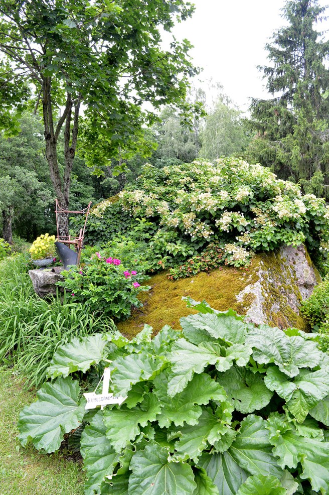 Underbar grönska med mossa, olika trädslag och en stor rabarberbuske. Lite blommor och en rostig prydnad, samt även en klätterhortensia här om jag inte tar helt fel.
