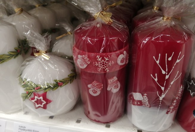 Därför blir man ju lite överraskad, för att inte säga lindrigt chockad – då man ser att JULEN kommit till Tokmanni! Lite så där försynt har den smugit in. Några ljus fanns inklämda bland de andra som var vita, gröna, bruna, grå.