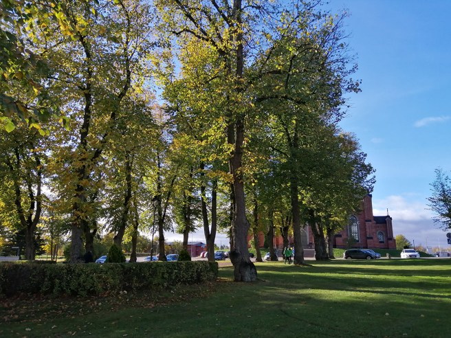 Visar istället grönskan i Kyrkoparken i Lovisa. Tänk att det finns så här många löv kvar på vissa träd. Alla är inte ens gula eller röda. Från en lönn på gården där jag bor har nästan alla löv blåst bort.