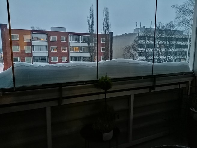 På fönster som har söder- eller västerläge har snön inte packat sig verkar det som. Det ser man på grannarnas bostäder i husen mittemot, de har söderläge för fönstren. Mina som ligger i norrläge har fått små snövallar 🙂