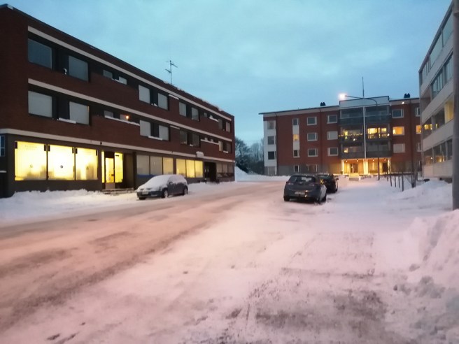 Östra Tullgatan i Lovisa. Huset jag bor i står till höger. Huset rakt fram är det som heter Corona… kanske inte så lustigt i dagens läge 😀