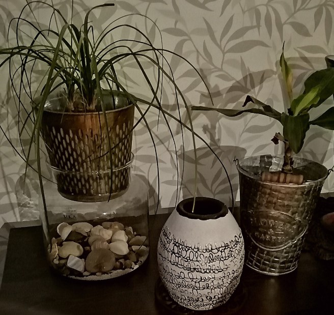 Krukan har jag placerat i glasburken för att växtens blad ska kunna hänga fritt. Stenarna och snäckorna är minnen från otaliga resor jag gjort genom åren, med eller utan sällskap.