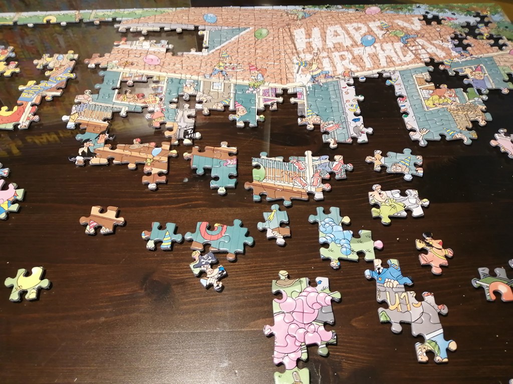 Detaljstudie av pusslet jag håller på med just nu. Med motiv från en mer eller mindre kaotisk födelsedagsfest för barn 🙂