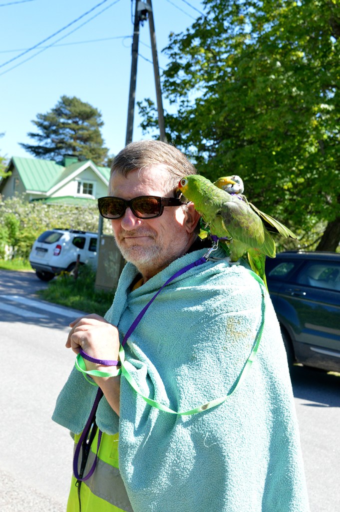 En man från Itis (Iitti på finska) besökte Lovisas Öppna trädgårdar i lördags. Han väckte uppmärksamhet med sina papegojor! Att han har en handduk över axlarna förstår jag. Fåglarna bajsar ju…