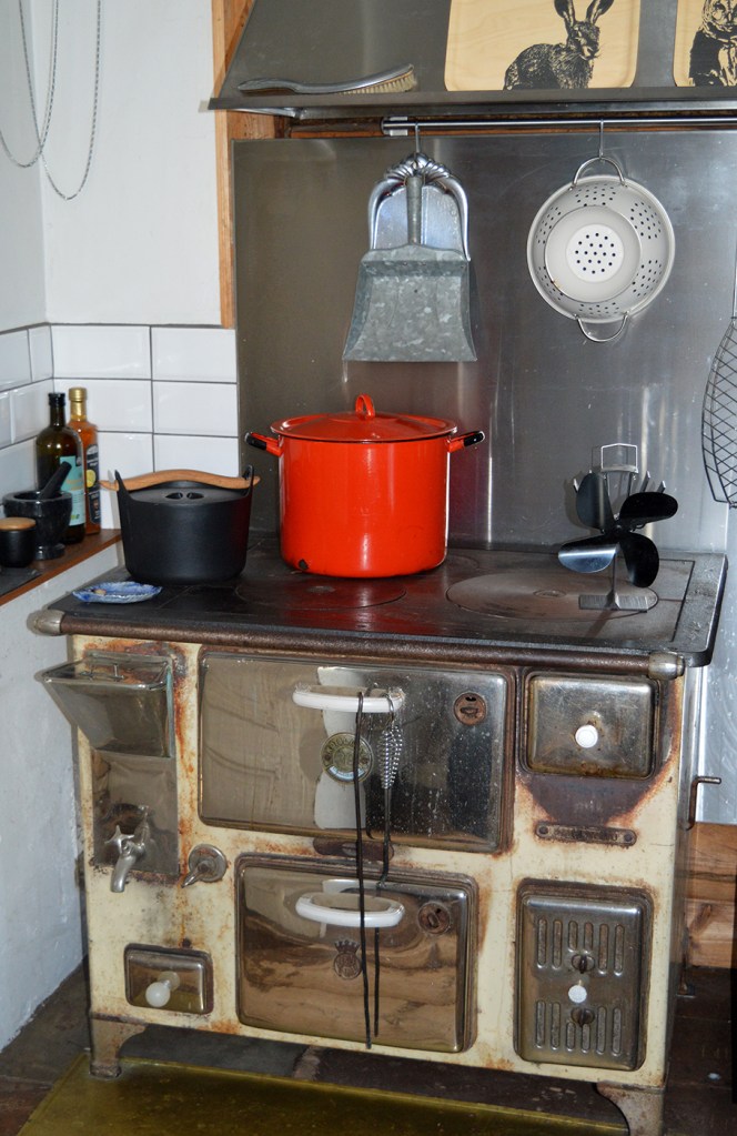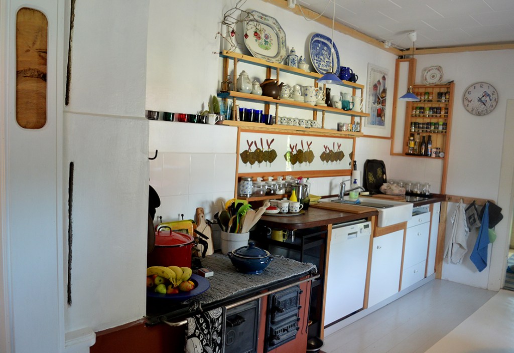 När jag steg in genom dörren från ett annat rum till det här kändes det nästan magiskt. Ljuset är fantastiskt och fönstren saknar gardiner, helt i min stil således.En del av huset och en liten del av gården, och en lite speciell hängmatta 🙂Solljuset fick det att glittra i gräset som om där legat diamanter, men det syns inte på bilden.På gården finns ett modernt lusthus i glas.Glasbuteljer och några strån från naturen, kan det bli enklare och vackrare?Här får någon sova, intill en eldstad.En gammal härlig spis. Intill den fanns en modernare variant.Verandan. Kolla väggarna, pärlsponten, taket, de varierande fönsterglasen, pelargonerna och den gamla soffan ❤