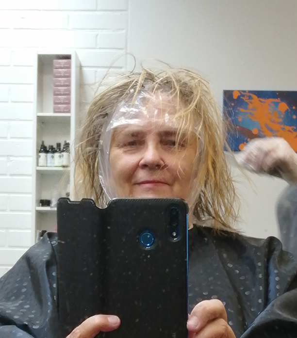Så här såg jag ut i frissan idag. Efteråt betydligt vackrare. Eller? Beror kanske på hur man ser på saken!