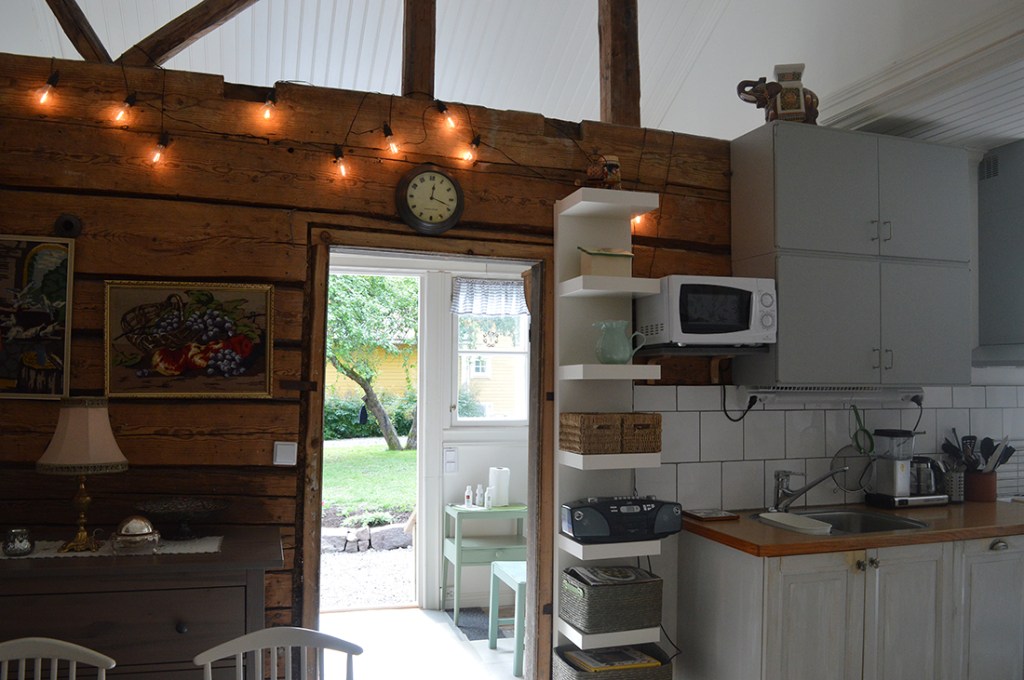Underbart med gamla stockväggar som lämnas synliga och som kompletteras med mer modern inredning och utrustning.