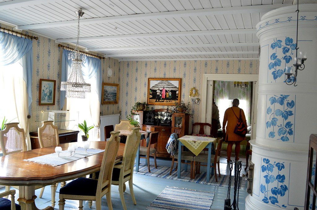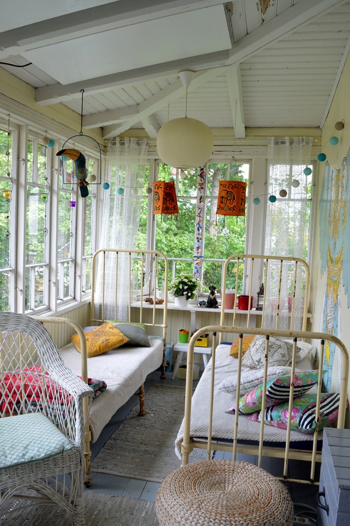 Fina gamla sängar – men synd att ställa dem där på verandan så att de fina fönstren skyms. Fantastiskt vacker kakelugn, finskt blåvit! Mysigt!
